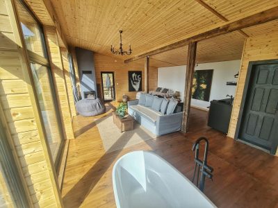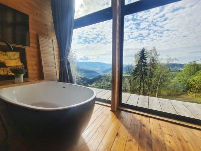 Are o capacitate de 2+1 pers. si include: baie cu dus si cada in zona deschisa langa geam, cu vedere la munti, zona de dormitor cu pat matrimonial de 160*2m, zona de living cu o canapea extensibila si zona de bucatarie dotata cu plita electrica cu inductie, esspresor pt. cafea boabe ( din partea casei ), prajitor de paine, micorunde, frigider, vesela, etc.