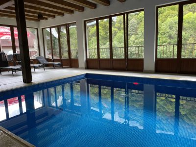 De asemenea, dispunem şi de o piscină interioară cu apă încălzită la temperatura optimă, o adevărată oază de relaxare ideală atât pentru familii, cât și pentru cupluri sau grupuri de prieteni. În plus, designul interior îmbină confortul cu eleganța, creând un spațiu primitor și intim.