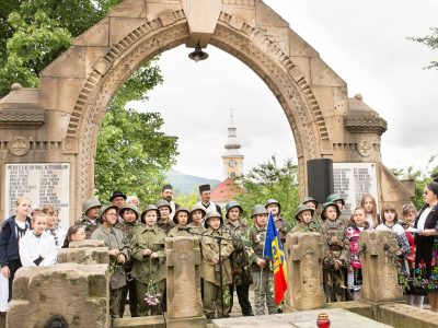 În spatele monumentului se află un osuar împrejmuit cu stâlpi de piatră uniți cu lanțuri. Pe ambele laturi sunt înscrise numele a 122 de eroi români, căzuți în cele două războaie mondiale.