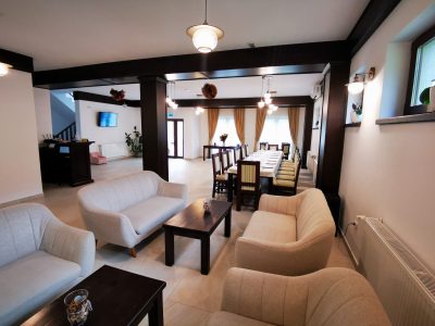 În salonul pensiunii veți fi răsfățați cu preparate tradiționale și delicatese culinare. Bucătăria complet utilată este la dispoziția oaspeților atunci când închiriați întreaga locație.