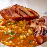 Ciolan/cârnați/friptură de porc , preparați în gospodăria proprie și afumate cu lemn de fag cu garnitură iahnie de fasole